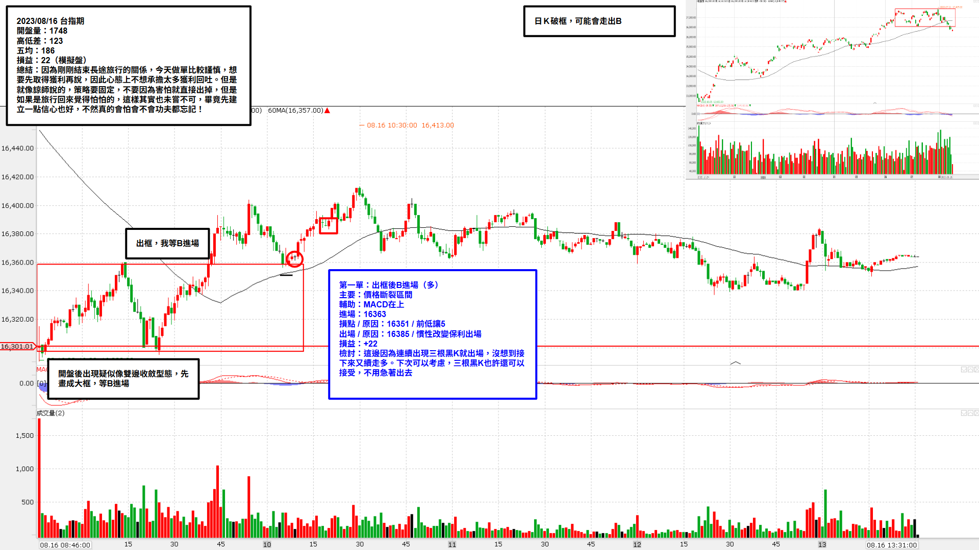 盤後評語:其實這張單除了損點真的沒有設好,其實算是合理的進場,因為確實有空方形態(不完美,但是有),也有明顯的B,也連續跌破兩隻黑K,只能說逆著日盤風險可能較高,但真的稱不上是完全失敗。 總結:今天做單有點操之過急了,因為依照我的經驗,夜盤大漲後,容易在隔天日盤修正,所以心裡有點期望會走空。在看到了一個空方B出現時,我馬上就出現了想要賭一下心態,然後就在一個損點很醜的位置進場。即使在第一時間已經盡可能把損點拉大,但最終還是難逃被掃的命運。看來我還是太容易預設立場了,如果我好好的照著盤做,應該就會知道要再多等一下,等反轉確立後,再準備做空(然後也就會發現今天的盤很黏,根本走不出去)。 而且我有觀察到,今天這樣浮現賭性,我覺得是因為前幾天有大賺,所以心態有點膨脹,以為自己每天都能大賺,這樣不行!一定要回歸原始的心態,用看小說等分心的事情把自己拉回來,不要狂盯著盤,不然心態會容易被影響!一直死盯著盤只會覺得每個波動都是機會,但他們絕大多數都是無意義的,即使沒做也不算錯過,所以還是讓眼球分心一下吧,看到好的獵物再開槍,別浪費子彈! (下圖可以點擊放大)