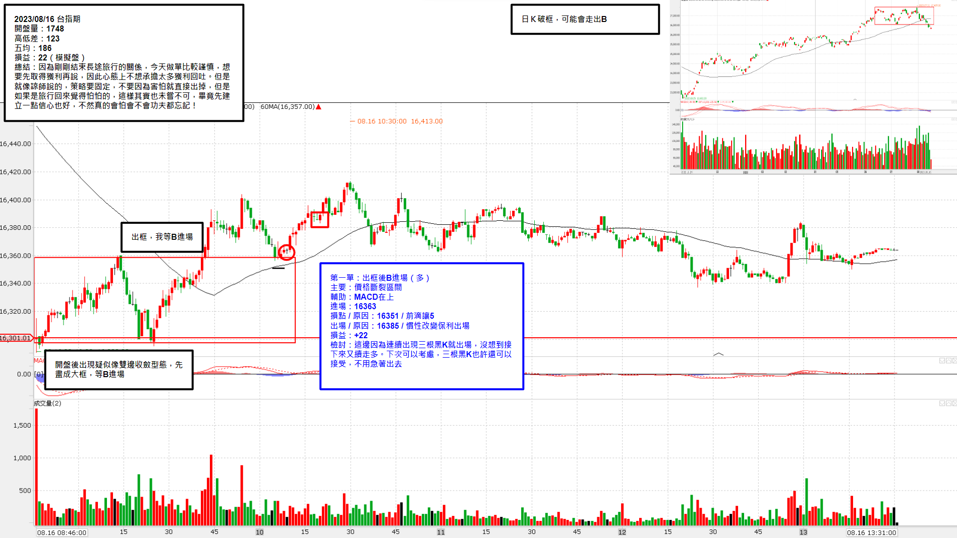 盤後評語:其實這張單除了損點真的沒有設好,其實算是合理的進場,因為確實有空方形態(不完美,但是有),也有明顯的B,也連續跌破兩隻黑K,只能說逆著日盤風險可能較高,但真的稱不上是完全失敗。 總結:今天做單有點操之過急了,因為依照我的經驗,夜盤大漲後,容易在隔天日盤修正,所以心裡有點期望會走空。在看到了一個空方B出現時,我馬上就出現了想要賭一下心態,然後就在一個損點很醜的位置進場。即使在第一時間已經盡可能把損點拉大,但最終還是難逃被掃的命運。看來我還是太容易預設立場了,如果我好好的照著盤做,應該就會知道要再多等一下,等反轉確立後,再準備做空(然後也就會發現今天的盤很黏,根本走不出去)。 而且我有觀察到,今天這樣浮現賭性,我覺得是因為前幾天有大賺,所以心態有點膨脹,以為自己每天都能大賺,這樣不行!一定要回歸原始的心態,用看小說等分心的事情把自己拉回來,不要狂盯著盤,不然心態會容易被影響!一直死盯著盤只會覺得每個波動都是機會,但他們絕大多數都是無意義的,即使沒做也不算錯過,所以還是讓眼球分心一下吧,看到好的獵物再開槍,別浪費子彈! (下圖可以點擊放大)
