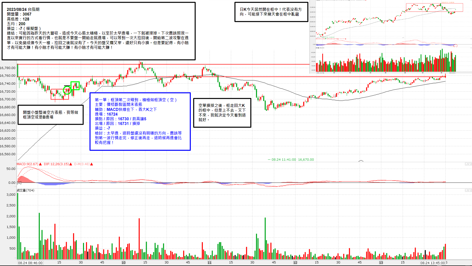 盤後評語:其實這張單除了損點真的沒有設好,其實算是合理的進場,因為確實有空方形態(不完美,但是有),也有明顯的B,也連續跌破兩隻黑K,只能說逆著日盤風險可能較高,但真的稱不上是完全失敗。 總結:今天做單有點操之過急了,因為依照我的經驗,夜盤大漲後,容易在隔天日盤修正,所以心裡有點期望會走空。在看到了一個空方B出現時,我馬上就出現了想要賭一下心態,然後就在一個損點很醜的位置進場。即使在第一時間已經盡可能把損點拉大,但最終還是難逃被掃的命運。看來我還是太容易預設立場了,如果我好好的照著盤做,應該就會知道要再多等一下,等反轉確立後,再準備做空(然後也就會發現今天的盤很黏,根本走不出去)。 而且我有觀察到,今天這樣浮現賭性,我覺得是因為前幾天有大賺,所以心態有點膨脹,以為自己每天都能大賺,這樣不行!一定要回歸原始的心態,用看小說等分心的事情把自己拉回來,不要狂盯著盤,不然心態會容易被影響!一直死盯著盤只會覺得每個波動都是機會,但他們絕大多數都是無意義的,即使沒做也不算錯過,所以還是讓眼球分心一下吧,看到好的獵物再開槍,別浪費子彈! (下圖可以點擊放大)