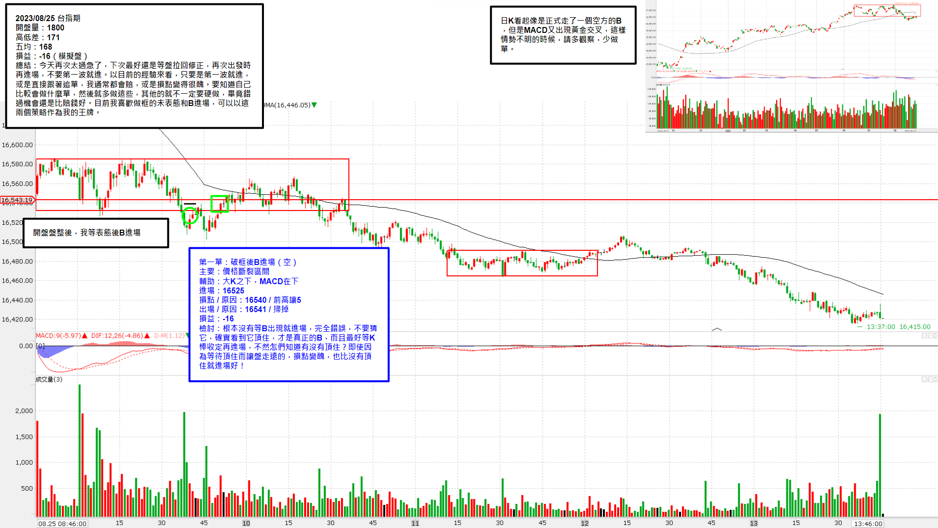 今天再次太過急了,下次最好還是等盤拉回修正,再次出發時再進場,不要第一波就進。以目前的經驗來看,只要是第一波就進,或是直接跟著追單,我通常都會賠,或是損點變得很醜。要知道自己比較會做什麼單,然後就多做這些,其他的就不一定要硬做,畢竟錯過機會還是比賠錢好。目前我喜歡做框的未表態和B進場,可以以這兩個策略作為我的王牌。