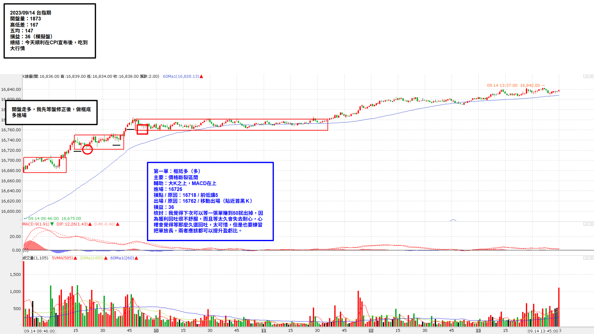 今天順利在CPI宣布後,吃到大行情。我覺得下次可以等一張單賺到50就出掉,因為獲利回吐很不舒服,而且等太久會失去耐心,心裡會覺得等那麼久還回吐,太可惜,但是也要練習把單放長,兩者應該都可以提升盈虧比。