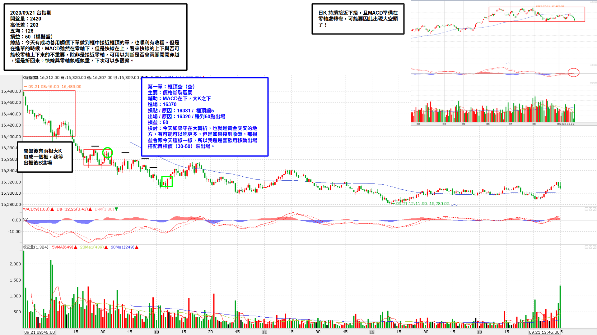 今天有成功善用觸價下單做到框中接近框頂的單,也順利有收穫。但是在進單的時候,MACD雖然在零軸下,但是快線在上,看來快線的上下與否可能較零軸上下來的不重要,除非是接近零軸,可用以判斷是否會兩腳開開穿越,還是折回來。快線與零軸孰輕孰重,下次可以多觀察。