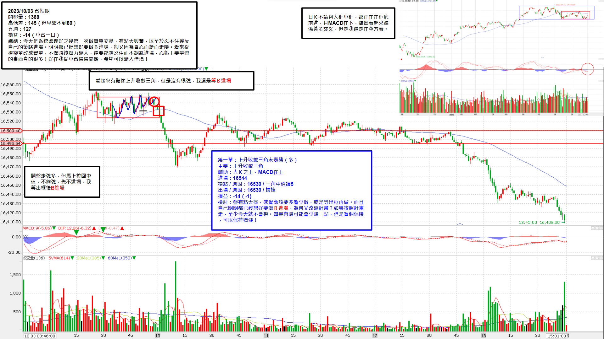 盤後評語:其實這張單除了損點真的沒有設好,其實算是合理的進場,因為確實有空方形態(不完美,但是有),也有明顯的B,也連續跌破兩隻黑K,只能說逆著日盤風險可能較高,但真的稱不上是完全失敗。 總結:今天做單有點操之過急了,因為依照我的經驗,夜盤大漲後,容易在隔天日盤修正,所以心裡有點期望會走空。在看到了一個空方B出現時,我馬上就出現了想要賭一下心態,然後就在一個損點很醜的位置進場。即使在第一時間已經盡可能把損點拉大,但最終還是難逃被掃的命運。看來我還是太容易預設立場了,如果我好好的照著盤做,應該就會知道要再多等一下,等反轉確立後,再準備做空(然後也就會發現今天的盤很黏,根本走不出去)。 而且我有觀察到,今天這樣浮現賭性,我覺得是因為前幾天有大賺,所以心態有點膨脹,以為自己每天都能大賺,這樣不行!一定要回歸原始的心態,用看小說等分心的事情把自己拉回來,不要狂盯著盤,不然心態會容易被影響!一直死盯著盤只會覺得每個波動都是機會,但他們絕大多數都是無意義的,即使沒做也不算錯過,所以還是讓眼球分心一下吧,看到好的獵物再開槍,別浪費子彈! (下圖可以點擊放大)