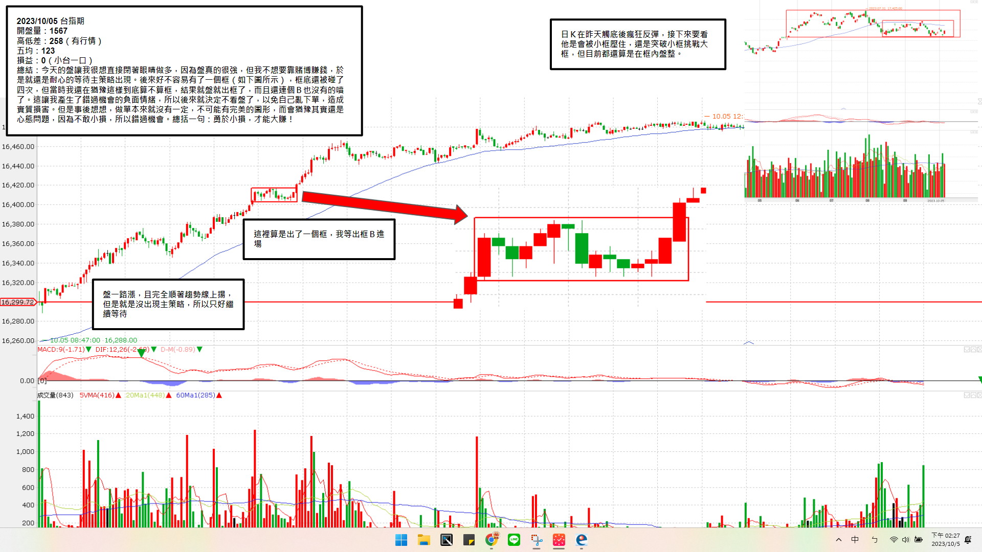 今天的盤讓我很想直接閉著眼睛做多,因為盤真的很強,但我不想要靠賭博賺錢,於是就還是耐心的等待主策略出現。後來好不容易有了一個框(如下圖所示),框底還被碰了四次,但當時我還在猶豫這樣到底算不算框,結果就盤就出框了,而且還連個B也沒有的噴了。這讓我產生了錯過機會的負面情緒,所以後來就決定不看盤了,以免自己亂下單,造成實質損害。但是事後想想,做單本來就沒有一定,不可能有完美的圖形,而會猶豫其實還是心態問題,因為不敢小損,所以錯過機會。總括一句:勇於小損,才能大賺!