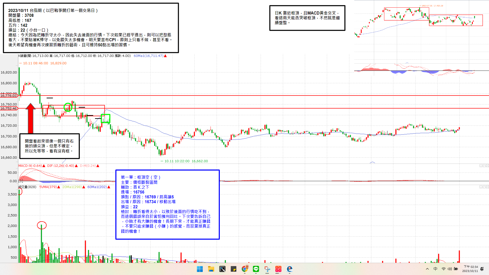 今天因為把轉折守太小,因此失去後面的行情。下次如果已經平進出,則可以把型態看大,不要貼著K棒守,以免錯失太多機會。明天要宣布CPI,原則上只看不做,甚至不看。後天希望有機會再次練習抓轉折的藝術,且可維持50點出場的習慣。