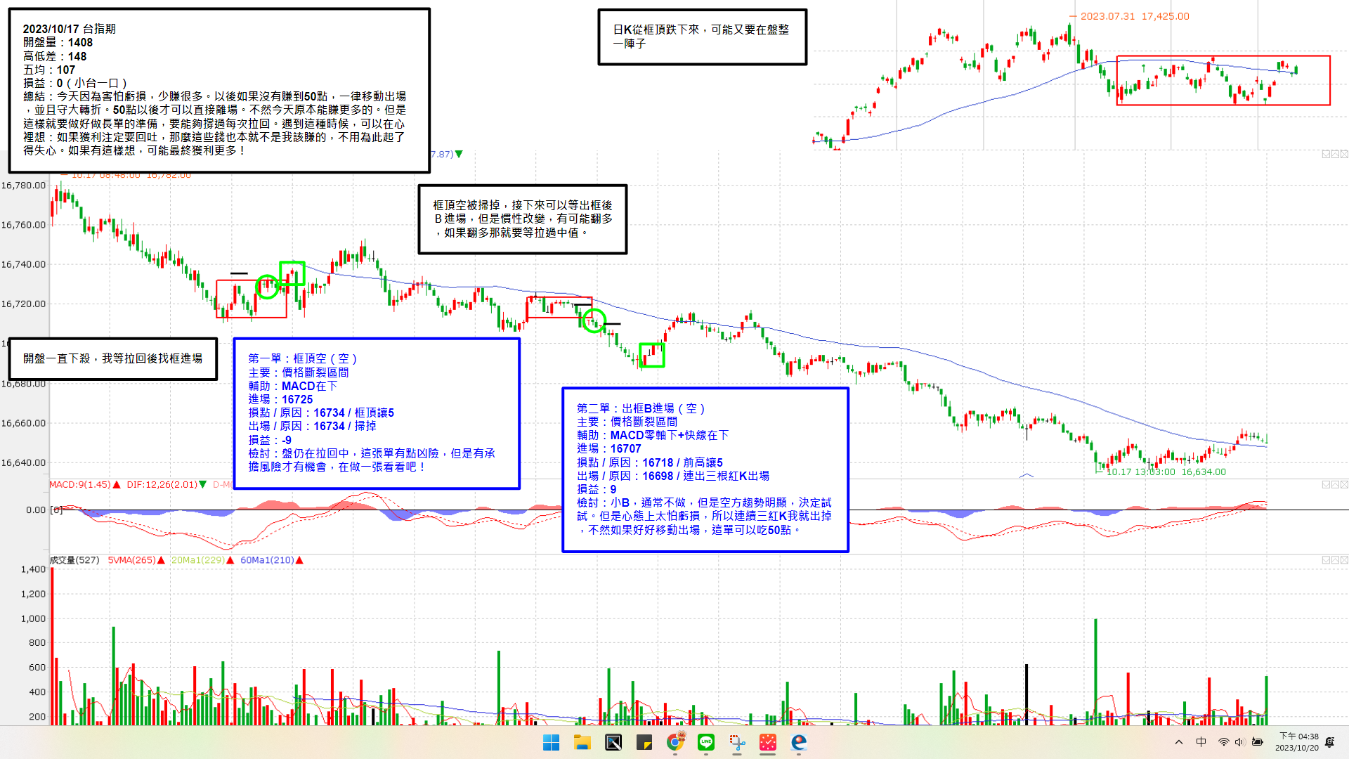 今天因為害怕虧損,少賺很多。以後如果沒有賺到50點,一律移動出場,並且守大轉折。50點以後才可以直接離場。不然今天原本能賺更多的。但是這樣就要做好做長單的準備,要能夠撐過每次拉回。遇到這種時候,可以在心裡想:如果獲利注定要回吐,那麼這些錢也本就不是我該賺的,不用為此起了得失心。如果有這樣想,可能最終獲利更多!