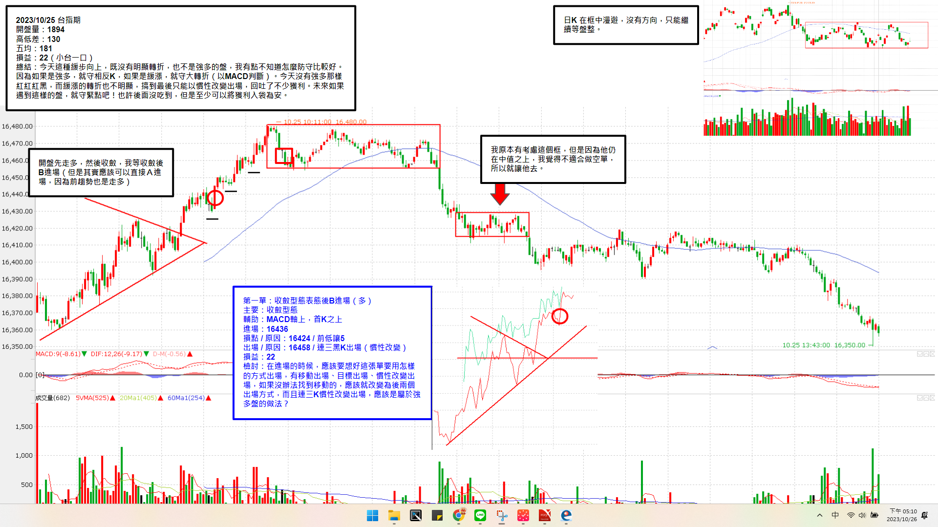 今天這種緩步向上,既沒有明顯轉折,也不是強多的盤,我有點不知道怎麼防守比較好。因為如果是強多,就守相反K,如果是緩漲,就守大轉折(以MACD判斷)。今天沒有強多那樣紅紅紅黑,而緩漲的轉折也不明顯,搞到最後只能以慣性改變出場,回吐了不少獲利。未來如果遇到這樣的盤,就守緊點吧!也許後面沒吃到,但是至少可以將獲利入袋為安。