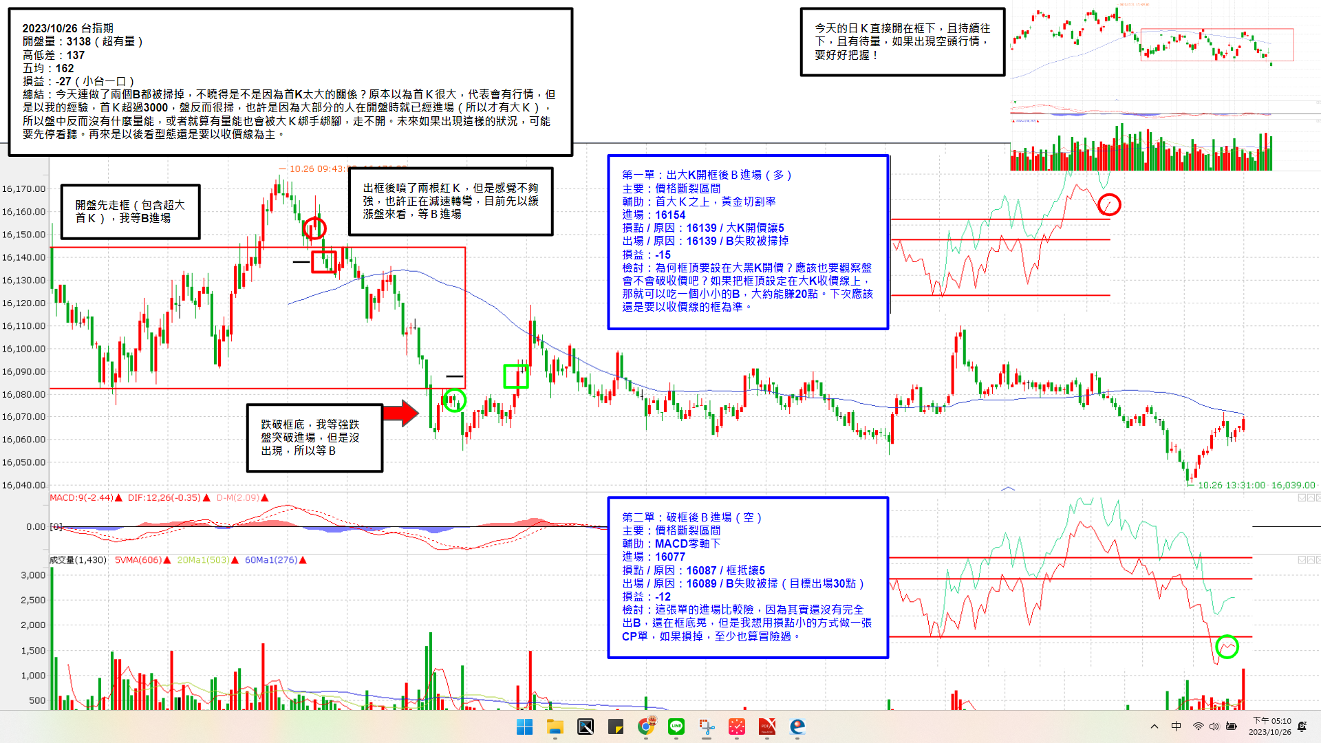 今天連做了兩個B都被掃掉,不曉得是不是因為首K太大的關係?原本以為首K很大,代表會有行情,但是以我的經驗,首K超過3000,盤反而很掃,也許是因為大部分的人在開盤時就已經進場(所以才有大K),所以盤中反而沒有什麼量能,或者就算有量能也會被大K綁手綁腳,走不開。未來如果出現這樣的狀況,可能要先停看聽。再來是以後看型態還是要以收價線為主。