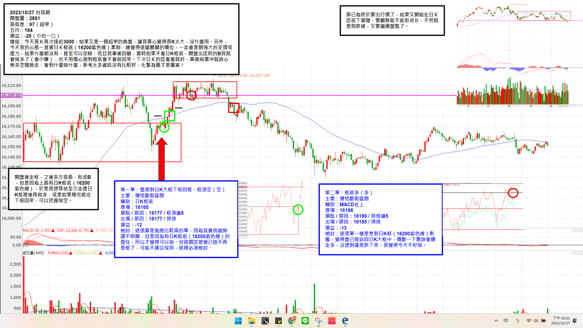 今天首K再次接近3000,結果又是一個超窄的鳥盤,讓我真心覺得首K太大,沒什麼用。另外,今天我的心態一直被日K框底(16200紫色線)牽制,總覺得這麼關鍵的價位,一定會是個強大的支撐或壓力,結果什麼都沒有,甚至可以忽略;而且我事後回顧,當時如果不看日K框底,開盤出匡時的B我就會做多了(會小賺),也不用擔心測到框底會不會殺回來。下次日K的匡看看就好,畢竟做當沖就該心無多空隨勢走,看到什麼做什麼,參考太多資訊沒有比較好,化繁為簡才是厲害!
