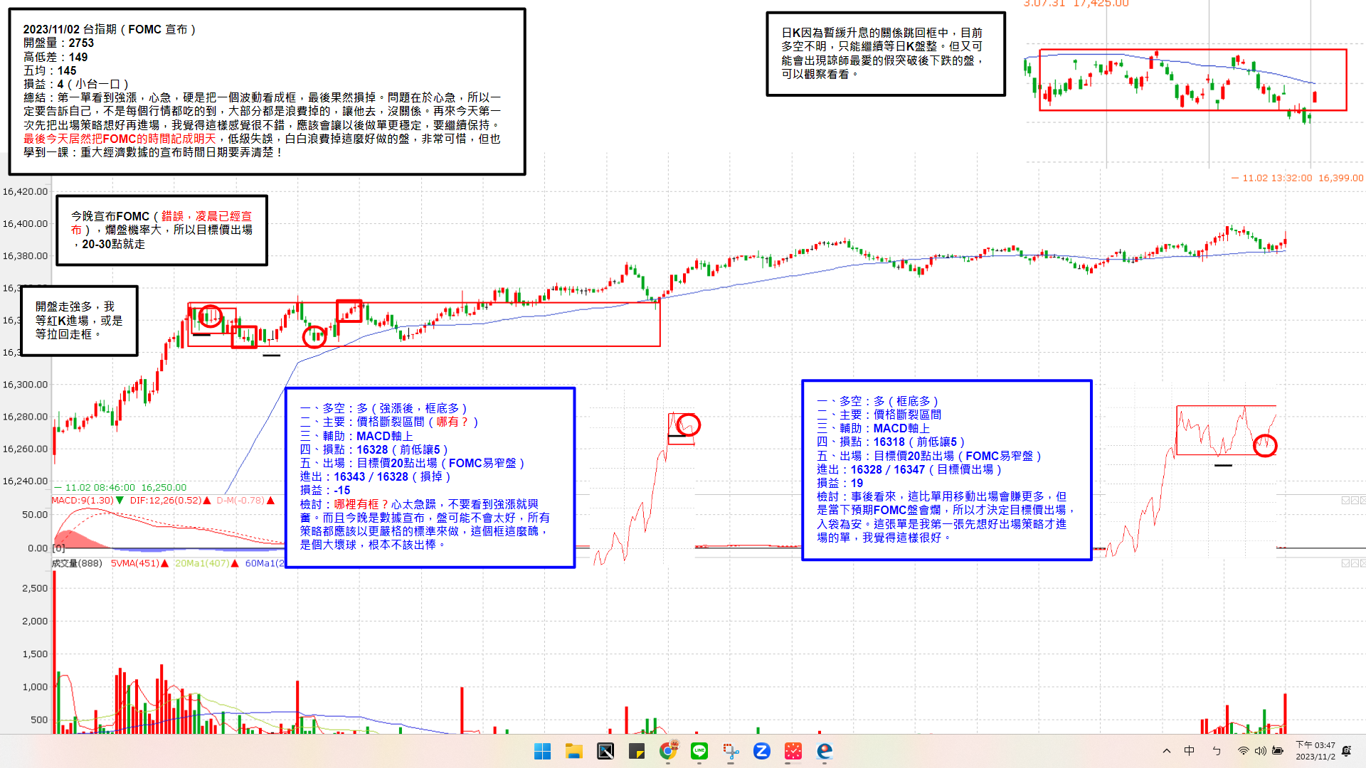 第一單看到強漲,心急,硬是把一個波動看成框,最後果然損掉。問題在於心急,所以一定要告訴自己,不是每個行情都吃的到,大部分都是浪費掉的,讓他去,沒關係。再來今天第一次先把出場策略想好再進場,我覺得這樣感覺很不錯,應該會讓以後做單更穩定,要繼續保持。最後今天居然把FOMC的時間記成明天,低級失誤,白白浪費掉這麼好做的盤,非常可惜,但也學到一課:重大經濟數據的宣布時間日期要弄清楚!