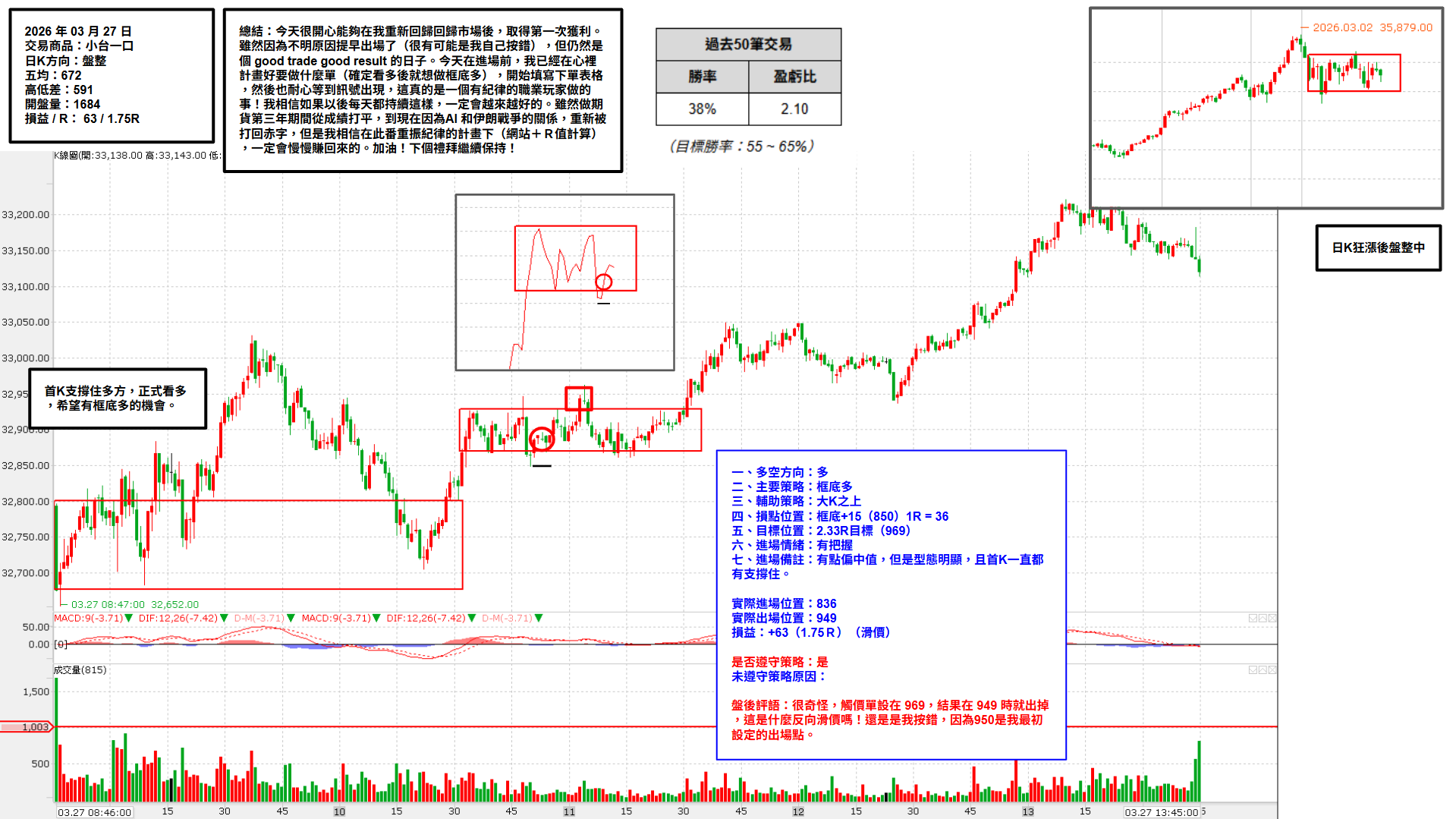 今天很開心能夠在我重新回歸回歸市場後,取得第一次獲利。雖然因為不明原因提早出場了(很有可能是我自己按錯),但仍然是個 good trade good result 的日子。今天在進場前,我已經在心裡計畫好要做什麼單(確定看多後就想做框底多),開始填寫下單表格,然後也耐心等到訊號出現,這真的是一個有紀律的職業玩家做的事!我相信如果以後每天都持續這樣,一定會越來越好的。雖然做期貨第三年期間從成績打平,到現在因為AI 和伊朗戰爭的關係,重新被打回赤字,但是我相信在此番重振紀律的計畫下(網站+R值計算),一定會慢慢賺回來的。加油!下個禮拜繼續保持!