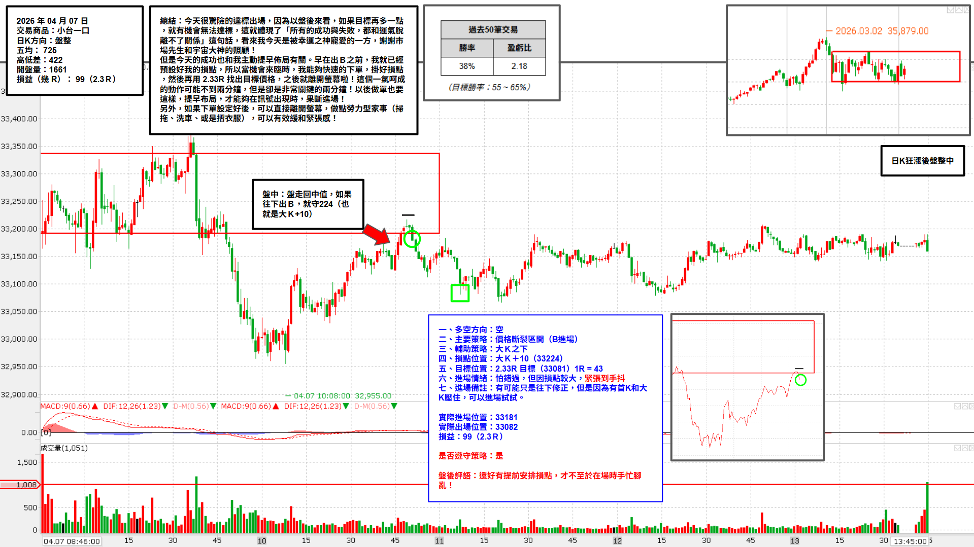 但是今天的成功也和我主動提早佈局有關。早在出B之前,我就已經預設好我的損點,所以當機會來臨時,我能夠快速的下單,掛好損點,然後再用 2.33R 找出目標價格,之後就離開螢幕啦!這個一氣呵成的動作可能不到兩分鐘,但是卻是非常關鍵的兩分鐘!以後做單也要這樣,提早布局,才能夠在訊號出現時,果斷進場!
