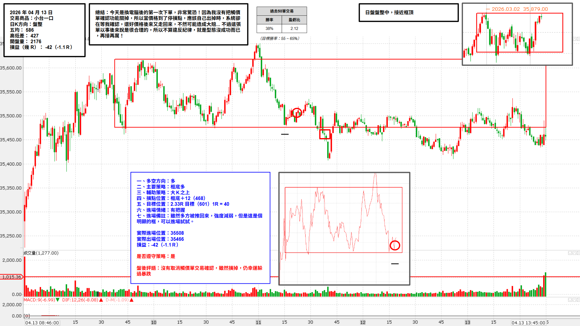 盤後評語:其實這張單除了損點真的沒有設好,其實算是合理的進場,因為確實有空方形態(不完美,但是有),也有明顯的B,也連續跌破兩隻黑K,只能說逆著日盤風險可能較高,但真的稱不上是完全失敗。 總結:今天做單有點操之過急了,因為依照我的經驗,夜盤大漲後,容易在隔天日盤修正,所以心裡有點期望會走空。在看到了一個空方B出現時,我馬上就出現了想要賭一下心態,然後就在一個損點很醜的位置進場。即使在第一時間已經盡可能把損點拉大,但最終還是難逃被掃的命運。看來我還是太容易預設立場了,如果我好好的照著盤做,應該就會知道要再多等一下,等反轉確立後,再準備做空(然後也就會發現今天的盤很黏,根本走不出去)。 而且我有觀察到,今天這樣浮現賭性,我覺得是因為前幾天有大賺,所以心態有點膨脹,以為自己每天都能大賺,這樣不行!一定要回歸原始的心態,用看小說等分心的事情把自己拉回來,不要狂盯著盤,不然心態會容易被影響!一直死盯著盤只會覺得每個波動都是機會,但他們絕大多數都是無意義的,即使沒做也不算錯過,所以還是讓眼球分心一下吧,看到好的獵物再開槍,別浪費子彈! (下圖可以點擊放大)